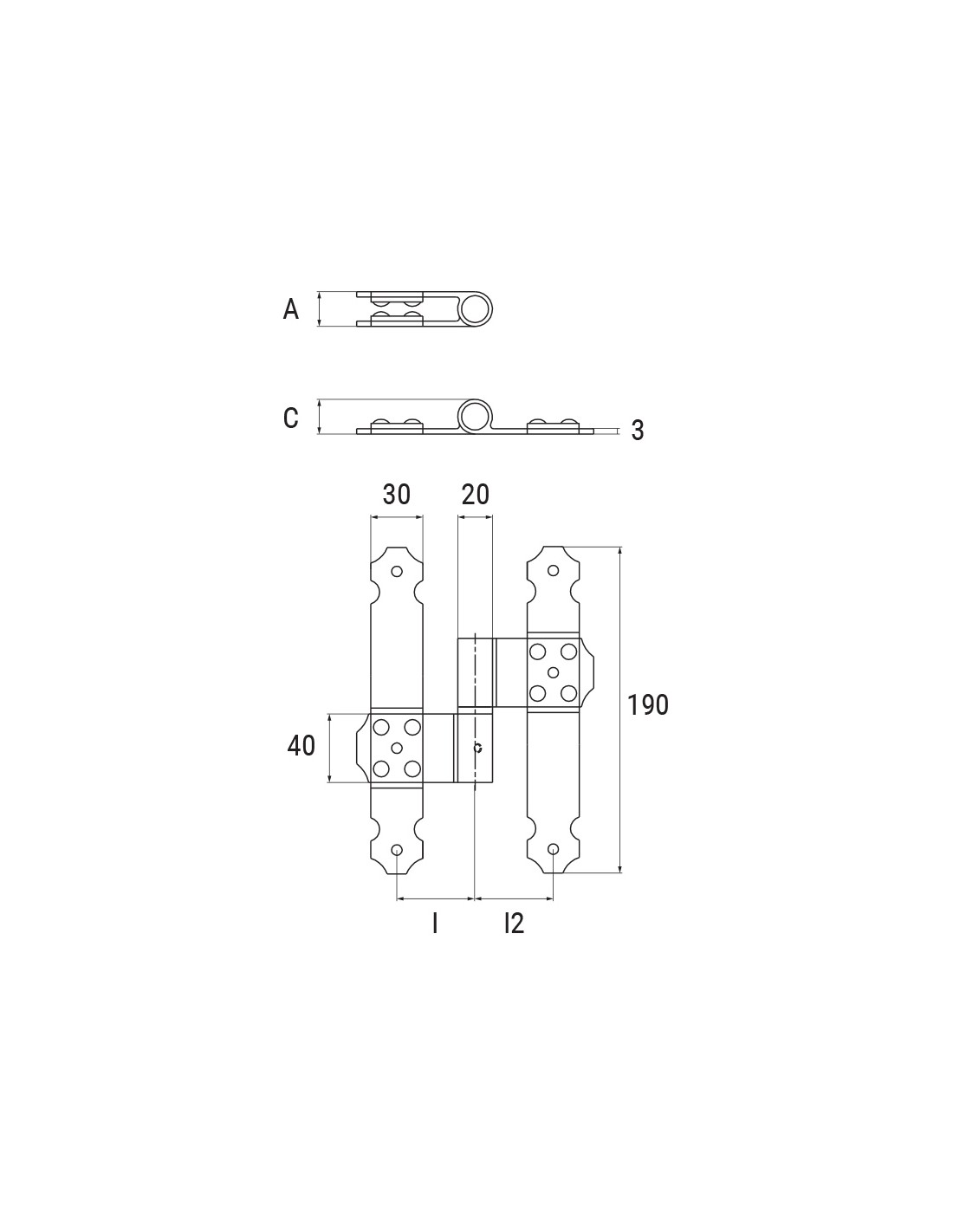 Third shutter adjustable right hinge in aluminium - I = 90 mm (I=45 mm + I2=45 mm) - Offset 10 mm - Coplanar.