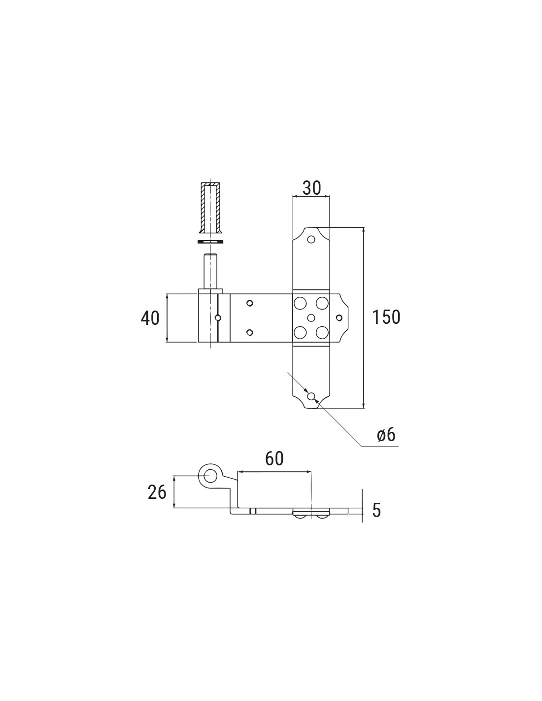 Gond d’intérieur, fixation sur ébrasement, avec axe inox à réglage vertical, rondelle et douille en nylon.
