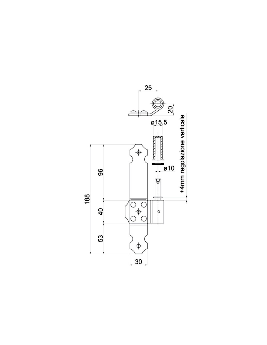 Cardine a piastra 30 x 03 sinistro con perno registrabile in verticale + rondella e boccola in nylon - I = 25 mm - Collo 20 mm.