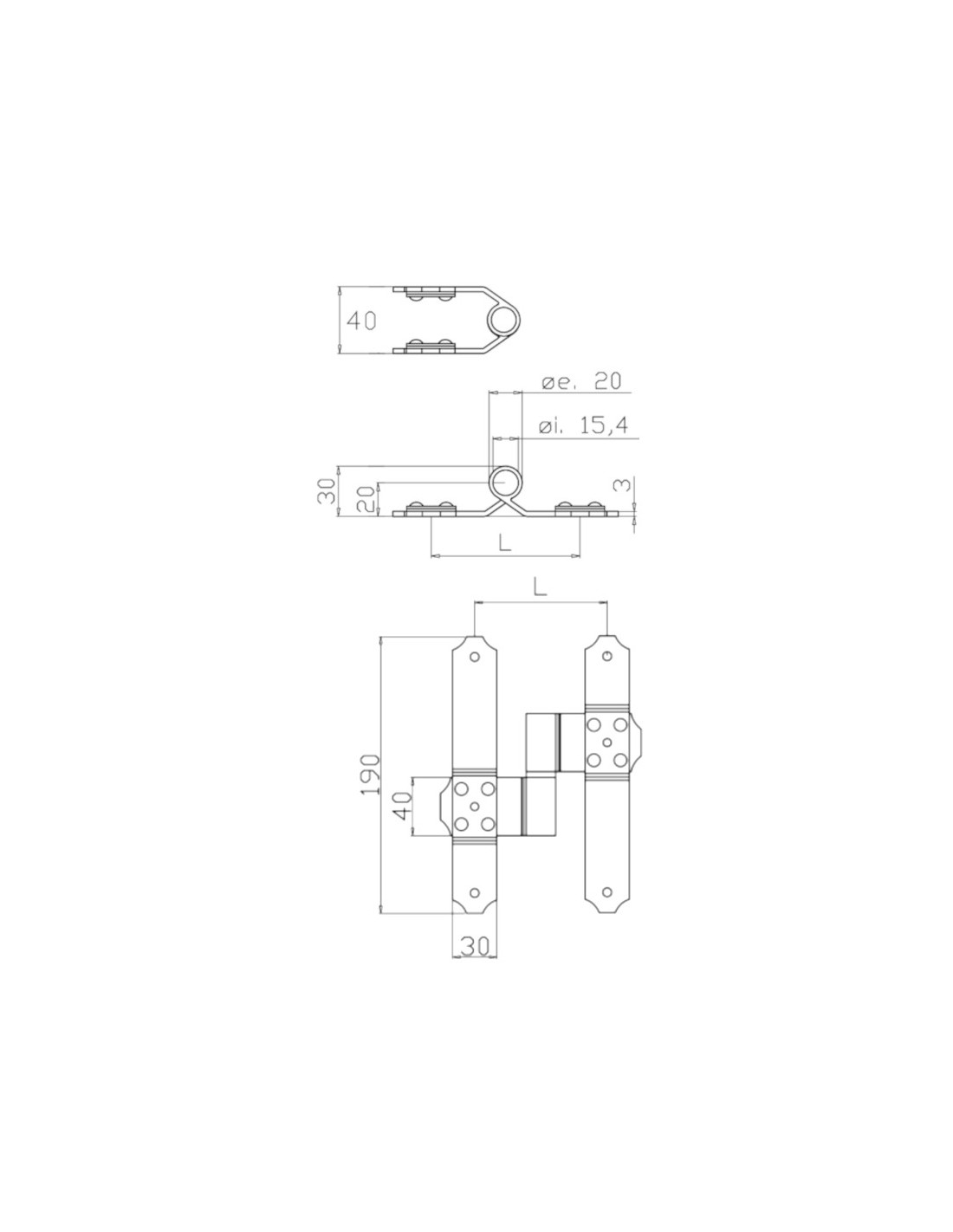 Cerniera per terza anta in alluminio destra registrabile - Interasse = 90 mm (I=45 mm + I2=45 mm) - Collo 20 mm.